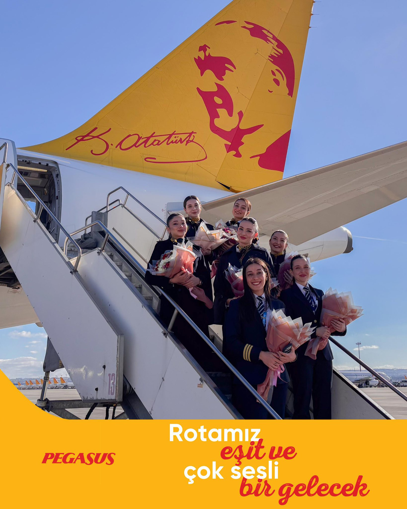 Pegasus Hava Yolları, tamamı kadın ekiple yapılan özel uçuşu, sosyal medya hesaplarından yaptığı paylaşımla duyurdu: