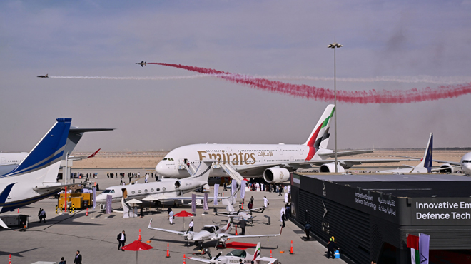 Birleşik Arap Emirlikleri’nin havacılık alanındaki etkileyici yetkinliklerini yansıtan gösteri uçuşu; Emirates’in öncülük ettiği ticari havacılık filosu, diğer BAE havayolları ve askeri uçaklar ile helikopterlerden oluşan toplam 60 uçaklık bir formasyonla gerçekleştirildi. Gösteri kapsamında Emirates A380, 500 ft, Boeing 777 700 ft, A350 ise 900 ft irtifada uçtu. Dubai Airshow’un en çok ilgi gören etkinliklerinden biri olan bu görsel şölen, Al Maktoum Uluslararası Havalimanı (DWC) pisti üzerinde yükselerek binlerce ziyaretçiye unutulmaz anlar yaşattı.