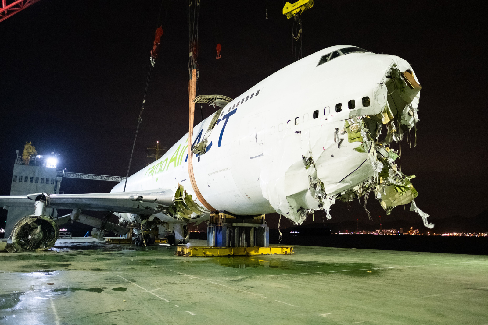 Hong Kong Havalimanı'nda geçtiğimiz hafta pistten çıkarak görevli devriye aracına çarpan ve iki kişinin ölümüne neden olan Air ACT'ye ait Boeing 747-400 tipi kargo uçağının enkazı denizden çıkarıldı.