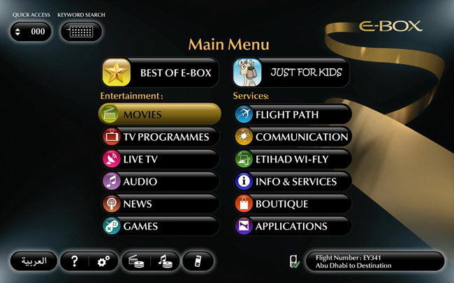 Etihad Havayolları'nın "Etihad Wi-Fly" olarak isimlendirdiği uçak içi bağlantı hizmetleri; Panasonic Avionics Küresel İletişim Süiti ile OnAir kabin içi bağlantı çözümünün birleşiminden oluşuyor ve kablosuz internet bağlantısı ile mobil hizmetleri ve canlı televizyon yayınını içeriyor. İnternet hizmeti kapsamında, yüksek hızlı geniş bant internete kablosuz olarak telefondan, tabletten ya da bilgisayardan bağlanılabiliyor. Mobil hizmetler kapsamında ise cep telefonuyla görüşme yapılabiliyor, mesajlaşılabiliyor ve e-posta alınıp gönderilebiliyor. Canlı televizyon yayını ise BBC World News, CNBC, CNN, euronews, Japan’s NHK World Premium, Sky News Arabia ve Sport 24 kanallarını kapsıyor.