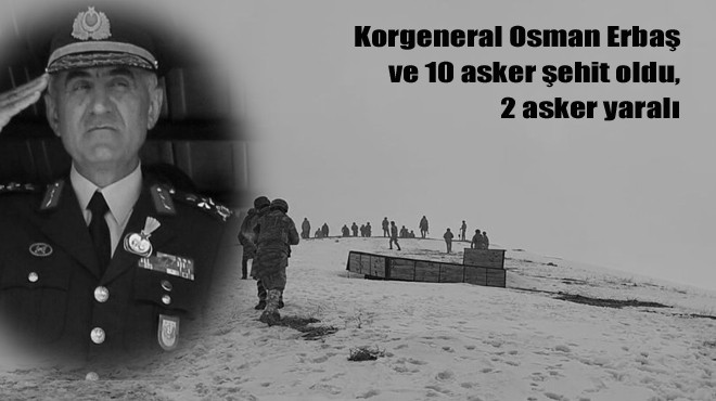 Milli Savunma Bakanlığı, Bitlis Tatvan’da bugün bir askeri helikopterin düştüğünü açıkladı. Bakanlık, 9 askerin şehit olduğunu 4 askerin de yaralandığını belirtti. Şehitler arasında Elazığ 8. Kolordu Komutanı Korgeneral Osman Erbaş'ın da olduğu öğrenildi. Korgeneral Erbaş, yaklaşık 5 yıldır 8. Kolordu Komutanlığını yürütüyordu. Ancak ilerleyen saatlerde gelen haberlere göre yaralı iki askerin de şehit olmasıyla, şehit sayısının 11'e yükseldiği kaydedildi.