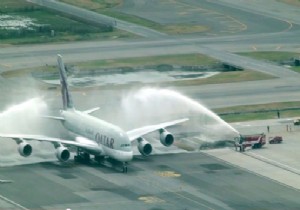 Qatar Havayolları Tayland Bangkok seferlerini tip büyüterek Airbus 380’le yapmaya başladı. Dev uçak Bangkok Suvarnabhumi Havalimanı’na yaptığı ilk seferde su takı ile karşılandı.