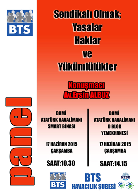BTS (Birleşik Taşımacılık Çalışanları Sendikası) yarın Atatürk Havalimanı’nda bir panel düzenleyecek. Panelin konusu, “Sendikalı olmak; yasalar haklar ve yükümlülükler.” Panelde Avukat Ersin Albuz konuşmacı olarak yer alacak.