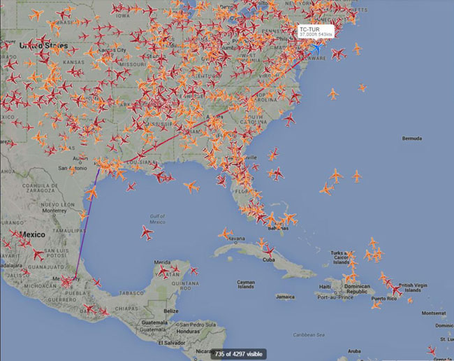 "Planefinder" internet sitesindeki radar görüntüleri, Erdoğan ve beraberindeki heyeti taşıyan uçağın Houston'a indikten sonra ABD'nin kuzeydoğusuna doğru hareket ettiğine işaret ediyor.
