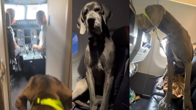 Los Angeles’ten New York’a uçacak olan Gabriel Bogner, dünyanın en iri köpek ırklarından kabul edilen Danua cinsi köpeğini uçurmak için American Airlines uçağında üç koltuk birden satın aldı.