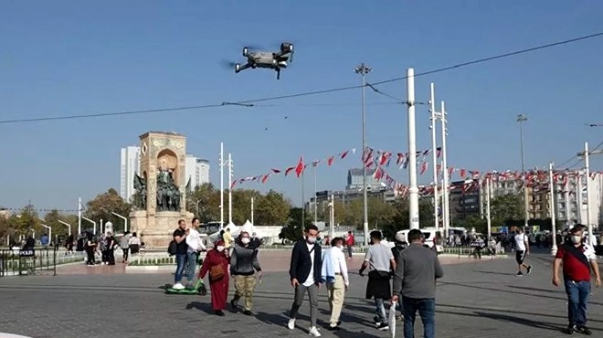 İstanbul Taksim'de polis drone destekli maske denetimi yaptı. Maskesini çenesine indirenler ve maske takmayan kişiler tek tek uyarıldı.