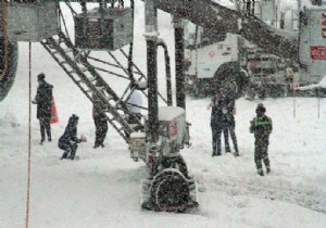 Öte yandan, karla mücadele çalışmalarının sürdüğü havalimanında uçakların yanaştığı körüklerin önündeki çizgiler ise belirgin hale gelmesi için fırça ile temizlendi.