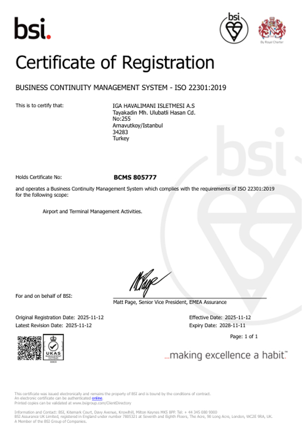 Yolcu deneyiminin kesintisizliği, uçuş operasyonlarının güvenilirliği ve altyapı yönetiminin sürekliliği için kritik önem taşıyan ISO 22301 belgesi, yalnızca mevcut süreçlere uyumu değil, aynı zamanda sürdürülebilir, proaktif ve kesintisiz bir operasyon anlayışının kurumsal kültür haline getirildiğini de gösteriyor.