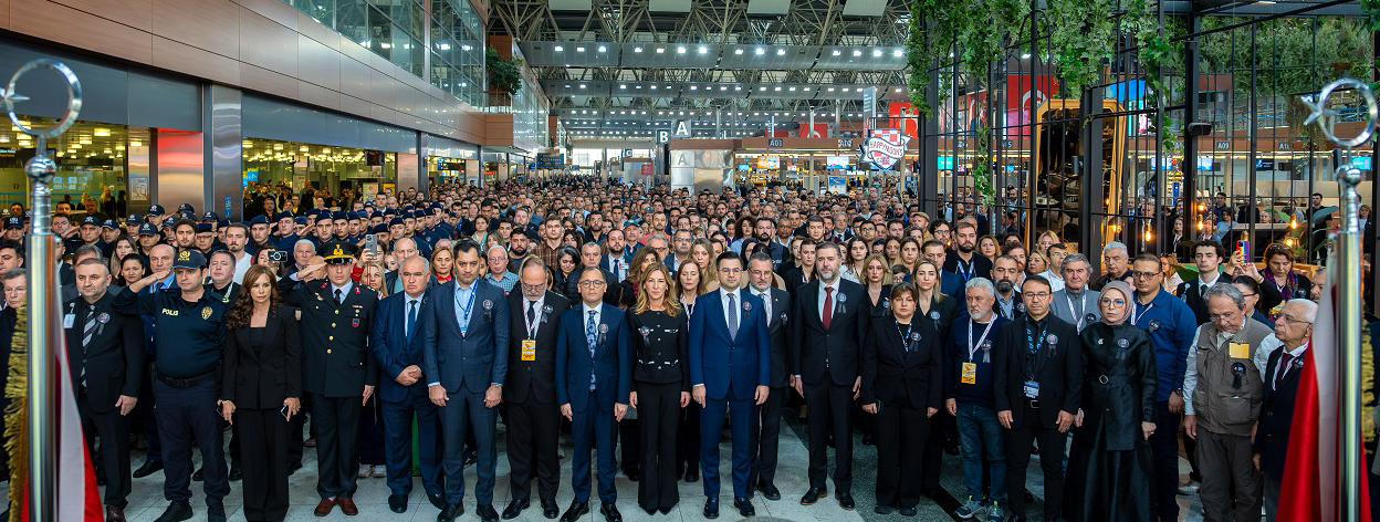 Saat 9'u 5 geçe sirenlerin çalmaya başlamasıyla Atatürk'e duyulan sevgi, saygı ve minnetin göstergesi olarak pasaport kontrolden check-in kontuarlarına tüm terminal genelinde Ulu Önder Mustafa Kemal Atatürk için saygı duruşunda bulunuldu, ardından İstiklal Marşı okundu.