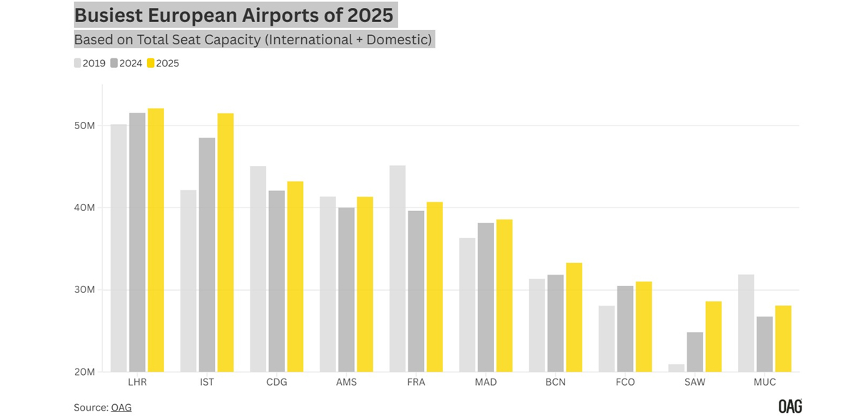 2025 yılı Dünyanın En Yoğun Havalimanları sıralamasını değerlendiren OAG Baş Analisti John Grant, küresel havacılığın yeni bir büyüme evresine geçtiğine işaret ederken İstanbul’un küresel bir merkez (hub) olarak yükselişinin de altını çizdi.