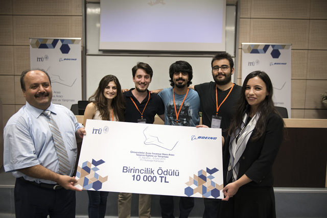 Kazanan öğrenci takımı ödülünü İTÜ Rektör Yardımcısı Prof.Dr. İbrahim Özkol ve Boeing International Türkiye Kuzey Afrika Strateji Sanayi ve Kamu İlişkileri Yardımcı Direktörü Filiz Hayırlı Tepebaşı’nın elinden aldı.