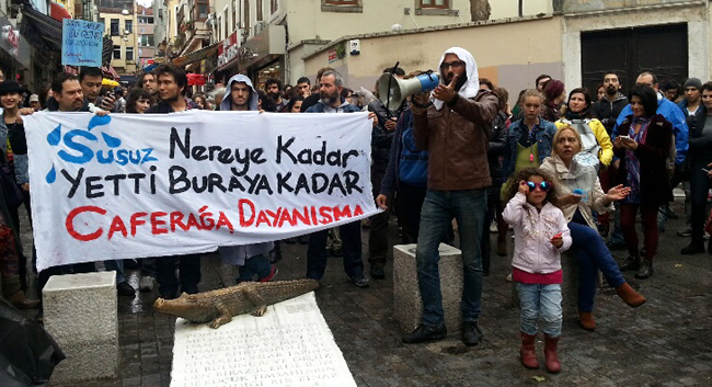 "Caferağa Dayanışması" isimli grup, Moda Parkı’nda bir araya gelerek suların akmamasını protesto etti. Grup, "TOMA’ya değil Moda’ya su" ve "Susma, sustukça sular hiç gelmeyecek" şeklinde slogan atarken, bazı eylemcilerin ise bornozla eyleme katılması dikkat çekti.
