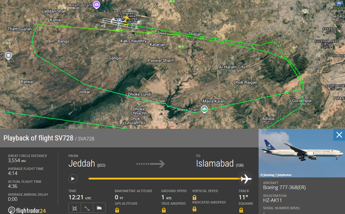 Cidde-İslamabad (Pakistan) seferini yapan Suudi Arabistan Havayolları'na ait bir Boeing 777-300 tipi uçağın pilotu, İslamabad’da bakım nedeniyle kapalı olan 28L pistine inmeye kalkıştı. Uçak 1000 feet yükseklikteyken duruma hava trafik kontrolörü müdahale ederek, pilotları uyardı. Uçak tekrar 5000 feet irtifaya çıkarak tur attıktan sonra havalimanının 28R pistine güvenli bir şekilde indi.