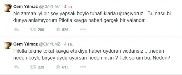“Pilotla tekme tokat kavga etti diye haber uyduran vicdansız ....neden neden böyle bir şey uyduruyorsun neden niçin ? Tek sorum bu.. Neden?