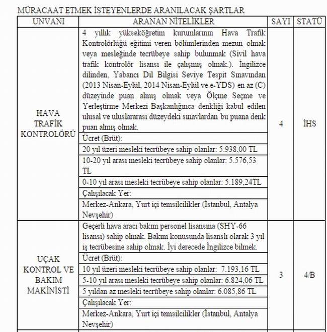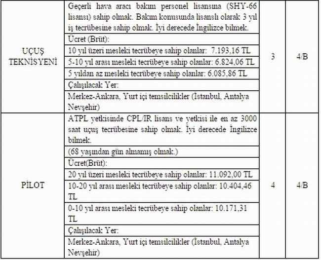 SHGM'den yapılan açıklamada 5431 sayılı Sivil Havacılık Genel Müdürlüğü Teşkilat ve Görevleri Hakkında Kanununun 25 inci maddesi uyarınca aşağıdaki tabloda belirtilen nitelik ve sayıda İdari Hizmet Sözleşmeli (İHS) Hava Trafik Kontrolörü” ve 6/6/1978 tarih ve 7/15754 sayılı Bakanlar Kurulu Kararı ile yürürlüğe konulmuş olan Sözleşmeli Personel Çalıştırılmasına İlişkin Esasların ekli 1 sayılı cetvelinde bulunan sınav şartı aranmaksızın hizmete alınacak sözleşmeli personel pozisyon unvanlarından 4/B hizmet sözleşmeli “Uçak Kontrol ve Bakım Makinisti, Uçuş Teknisyeni ve Pilot” alınacağı duyuruldu.
