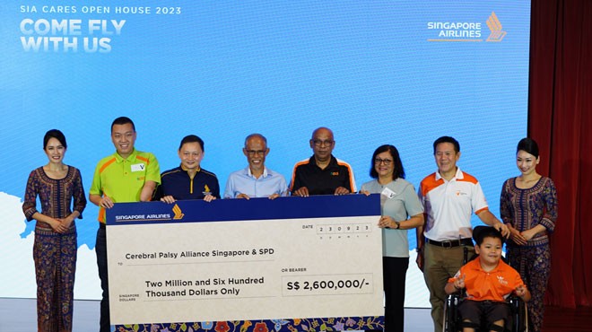 Singapore Airlines (SIA), SIA Cares bağış toplama kampanyasının bir parçası olarak, Singapur'da özel ihtiyaçları olan toplulukları destekleyen iki sosyal hizmet kurumu olan Cerebral Palsy Alliance Singapore (CPAS) ve SPD (Fiziksel Engelli Çocuklar Derneği) için 2,6 milyon dolar bağışladı. Hava yolunun ortakları, personeli ve halk son iki ayda bu kampanyaya 1,3 milyon dolar katkıda bulundu ve Singapur Havayolları da aynı miktarda 1,3 milyon dolar destek verdi.