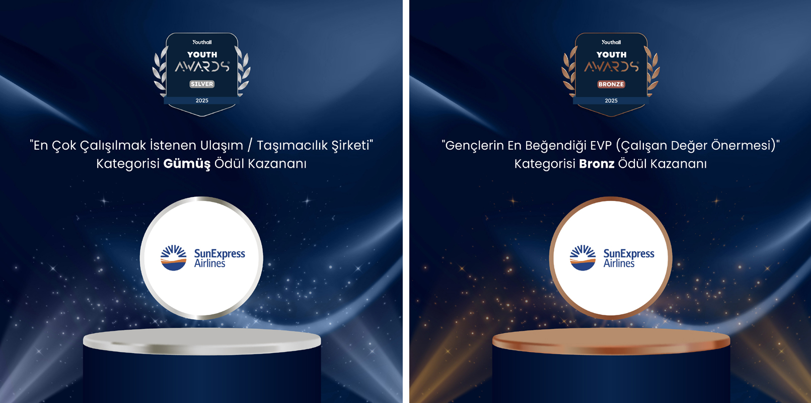 Türk Hava Yolları ve Lufthansa’nın ortak kuruluşu SunExpress, bu yıl beşinci kez düzenlenen Youth Awards® 2025’te iki farklı kategoride ödüle layık görüldü. Şirket, “En Çok Çalışılmak İstenen Ulaşım / Taşımacılık Şirketi” kategorisinde gümüş, “Gençlerin En Beğendiği EVP (Çalışan Değer Önermesi)” kategorisinde ise bronz ödülün sahibi oldu.