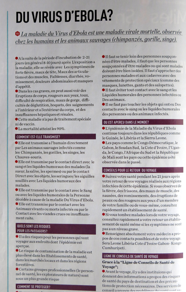 Normalde Türkçe ve İngilizce olarak yayınlanan THY’nin Skylife dergisinde, bu ülkelerin Fransızca konuşan halkları da dikkate alınarak “Ebola uyarıları” Fransızca olarak da yayınlandı.