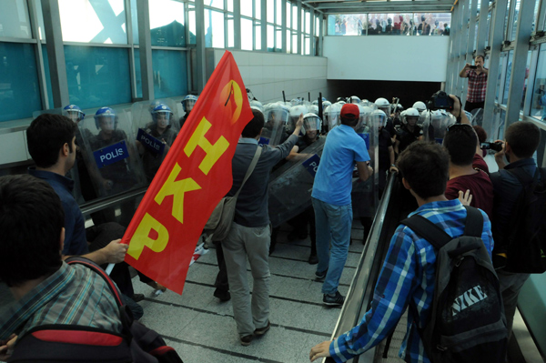 Arbede sırasında aralarında Halkın Kurtuluş Partisi (HKP), Dev-Lis ve Hava-İş Sendikası üyelerinin bulunduğu gruptan bazıları polise çöp kovalarını attı.