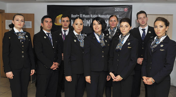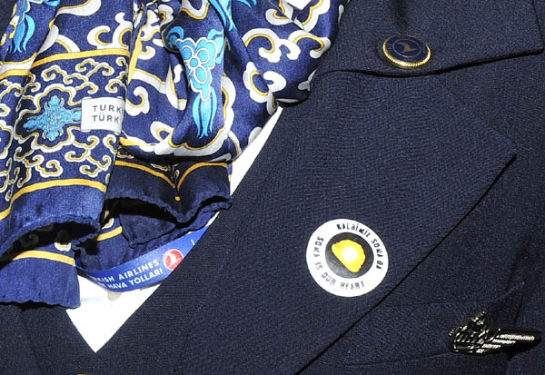 31 Mayıs Dünya Kabin Memurları Günü’nde görev yapan THY kabin ekipleri, Soma faciasında yaşamını yitiren madencilerin anısına yaptırılmış özel rozetleri takarak uçuyor. Ekip ve dinlenme odalarında rozet alarak yakalarına takan ekipler uçuşlara böyle gidiyor.