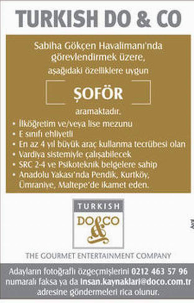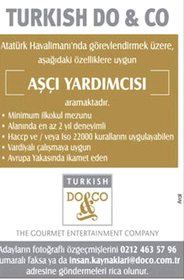 Turkish Do&Co,Atatürk Havalimanı'ndan görevlendirmek üzere 'Aşçı Yardımcısı' ve Sabiha Gökçen Havalimanı’ndan görevlendirmek üzere ise 'Şoför' arıyor.