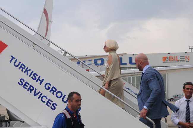 Atatürk Havaliman Genel Havacılık Terminali’ne VIP aracıyla gelen skandallar kraliçesi, giydiği kostümle yine tüm dikkatleri üzerine çekti. Araçtan inerek Boeing Business tipi özel uçağının merdivenlerine yönelen Lady Gaga, yüksek topuklu ayakkabıları nedeniyle merdivenleri ancak korumasının yardımıyla çıkabildi. Sarı peruğu, gözlükleri ve derin yırtmaçlı şeffaf elbisesiyle oldukça şık gözüken şarkıcı, uçağa bu kıyafetlerle bindi. Lady Gaga'nın İstanbul-Atina yolculuğunda bu kıyafetle rahat edip etmeyeceği ise soru işareti olarak kaldı.
