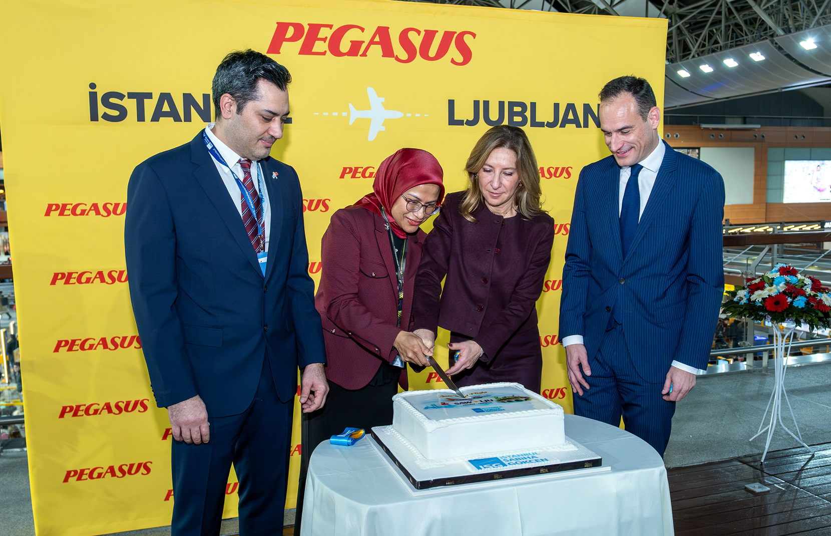 Pegasus Hava Yolları’nın, Sabiha Gökçen SAW – Ljubljana (LJU) hattının açılışı için düzenlenen törene Slovenya Büyükelçisi Gorazd Rencelj, Fahri Konsolos Mustafa Başar Arıoğlu, Pegasus Hava Yolları Genel Müdürü Güliz Öztürk, PGS Ticaret Genel Müdür Yardımcısı Onur Dedeköylü, PGS Satış Direktörü Emre Pekesen, ISG Ticari İşler ve Strateji Genel Müdür Yardımcısı (CCSO) Kerem Maybek, ISG Mali İşler Genel Müdür Yardımcısı (CFO) Hanita Ahmad ve terminal çalışanları katıldı.
