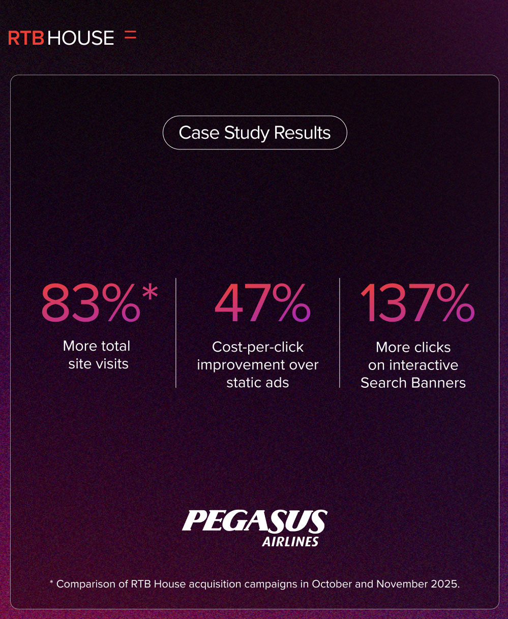 Kampanyanın başarısını değerlendiren Pegasus Hava Yolları Dijital Performans ve Büyüme Pazarlaması Lideri Dilek Güzel, şunları söyledi: "Almanya pazarında RTB House kampanyaları bizim için halihazırda etkili sonuçlar veriyordu ancak biz bu başarıyı daha da ölçeklendirmeyi hedefledik. Pegasus Hava Yolları olarak inovasyon ve verimliliğe odaklanıyoruz; bu noktada Arama Banner'ı çözümü hedeflerimizle kusursuz bir şekilde örtüştü. RTB House, ihtiyaçlarımızı anlama, yaratıcılık katma ve etkileyici bir maliyet verimliliğiyle yüksek kaliteli trafik sağlama konusundaki yeteneğini bir kez daha kanıtladı. Modern ve etkileşimli bir format olan bu banner'lar, müşterilerimizle her zamankinden daha fazla etkileşim kurdu ve ulaştığımız sonuçlar beklentilerimizin çok ötesine geçti."