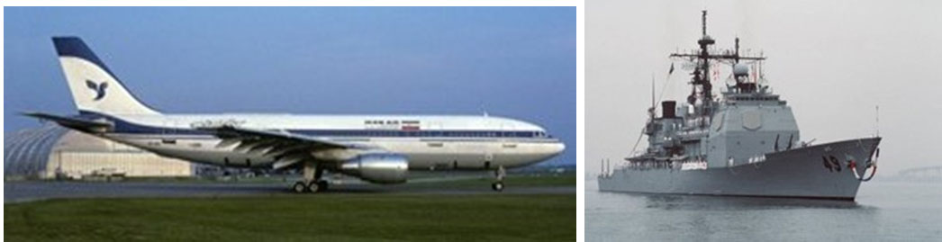 Solda düşürülen Airbus A-300 uçağı sağda düşüren USS Vincennes kruvazörü