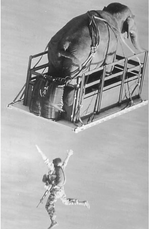 4.4.1968’de iki fil uçaktan özel paraşüt ve koşumlarıyla teker teker yere sağ salim indirilmişti. Bu eylem üç TV kanalı ve çok miktardaki uluslararası gazetecilerin huzurunda gerçekleştirilmişti. Bu olaydan esinlenerek 1995’de “Operation Dumbo Drop” filmi çekilmişti.