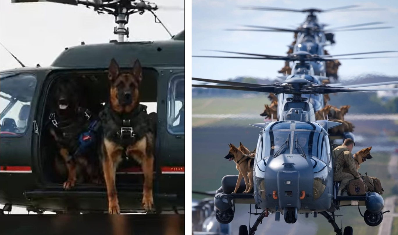 Solda Güney Afrika’da helikopterde atlayışa hazır Alman çoban köpekleri, Sağda ABD ordusunun köpekli tandem paraşütlü indirme birliği