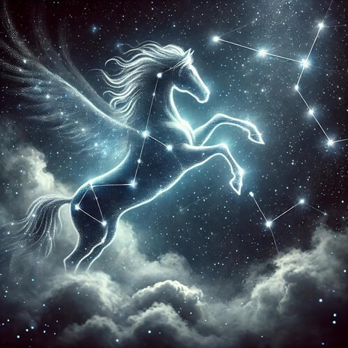 */ Pegasus Takımyıldızı: Bilinen en eski takımyıldızlardan biri olup ilk kez Batlamyus (Ptolemy) tarafından listelenmiştir. 15 adet yıldızı vardır. Herbirinin farklı uzaklıkta olmasına karşın takımyıldızın en dış elemanın dünyaya uzaklığı 133.35 ışık yılıdır.