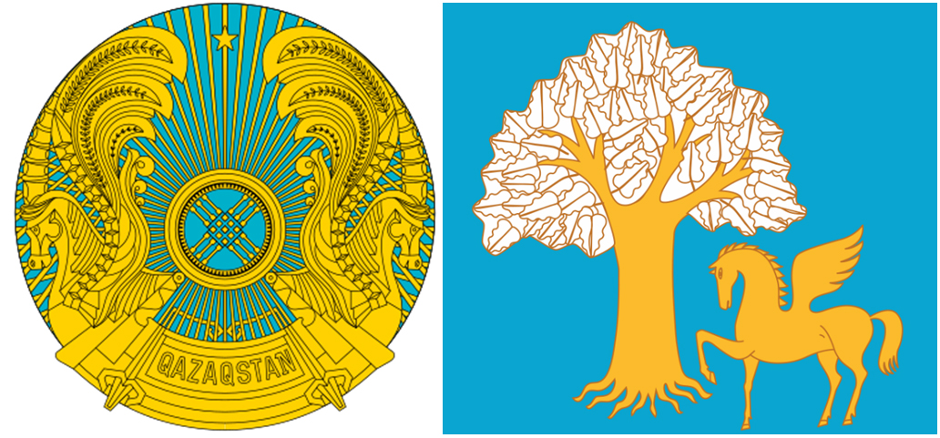 Solda Kazakistan’ın çift Tulpar’lı devlet arması, sağda Başkurdistan’da bir radyonun amblemi